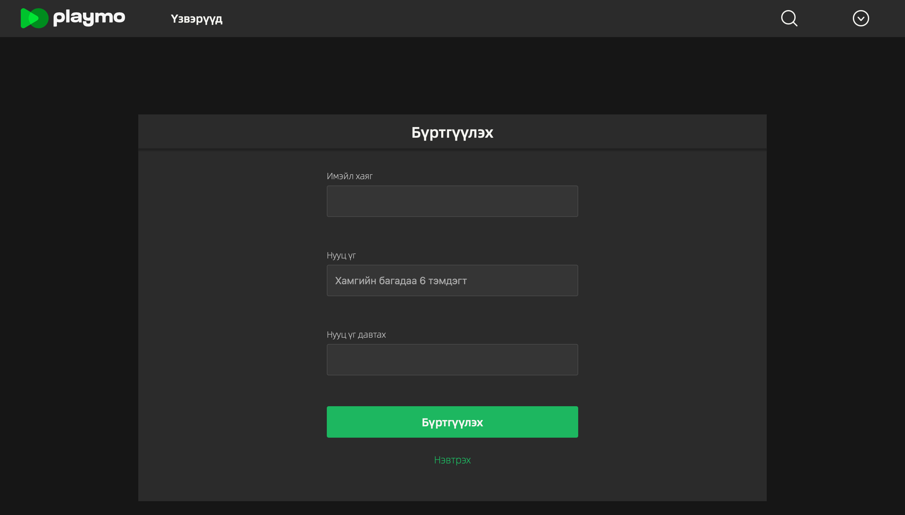 1. Та өөрийн ашиглаж буй төхөөрөмжийн хайлт хэсэгт Playmo.mn /https://playmo.mn/ гэж хайх эсвэл гар утас дээрээ аппликейшн /bit.ly/PlaymoApp энэ линкээр татах боломжтой/ татах бөгөөд танд дараах нэвтрэх хуудас харагдана.